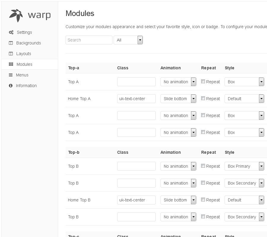 This theme comes with different module styles, badges and icons. For each module you can pick a style and combine it with an icon or badge to create your own unique look. Here is a list of the available options: